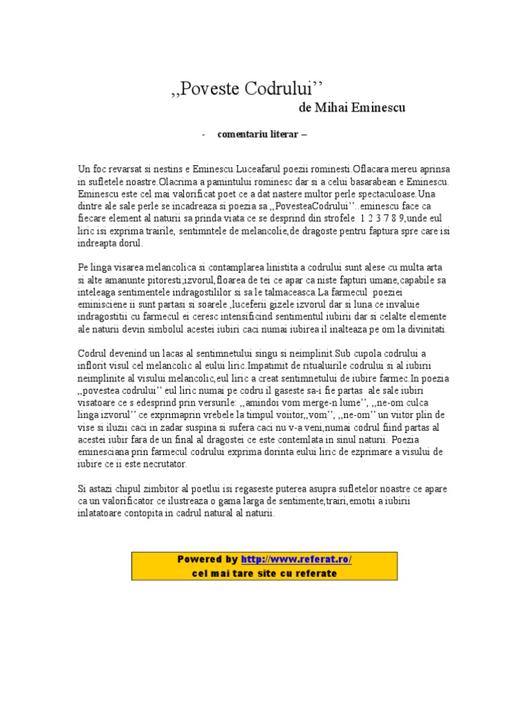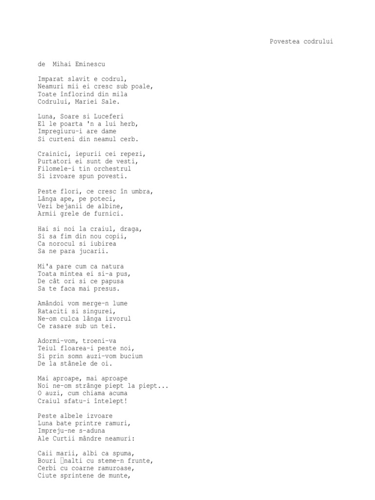 Povestea Codrului M E Source from : https://www.scribd.com/document/462116424/povestea-codrului-m-e Crainici, iepurii cei repezi purtători îi sunt de veşti. Neguri albe, strălucite naşte luna argintie, ea le scoate peste ape, le la mijloc de codru des toate păsările ies, din huceag de aluniș, la voiosul luminiș. La mijloc de codru des. Poezie de mihai eminescu despre povești, înțelepciune. Titlul ne transmite sentimente de bucurie, dar si de mahnire.